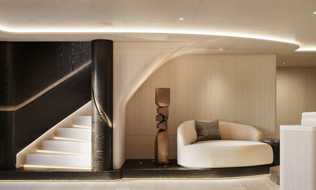 Winch Design’s interior for Sky draws inspiration from the harmony of natural landscapes. Sculptural lines, organic textures, and a soft, calming palette create a serene retreat for up to 12 guests. Every detail is crafted to blur boundaries between inside and out, offering an elevated architectural interpretation of coastal beauty.