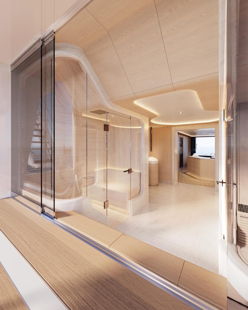 Midship, a dedicated spa sanctuary invites total relaxation, complete with sauna, steam room, and a fold-out platform opening directly to the ocean — a dreamlike spot for cooling off after a long day under sail.