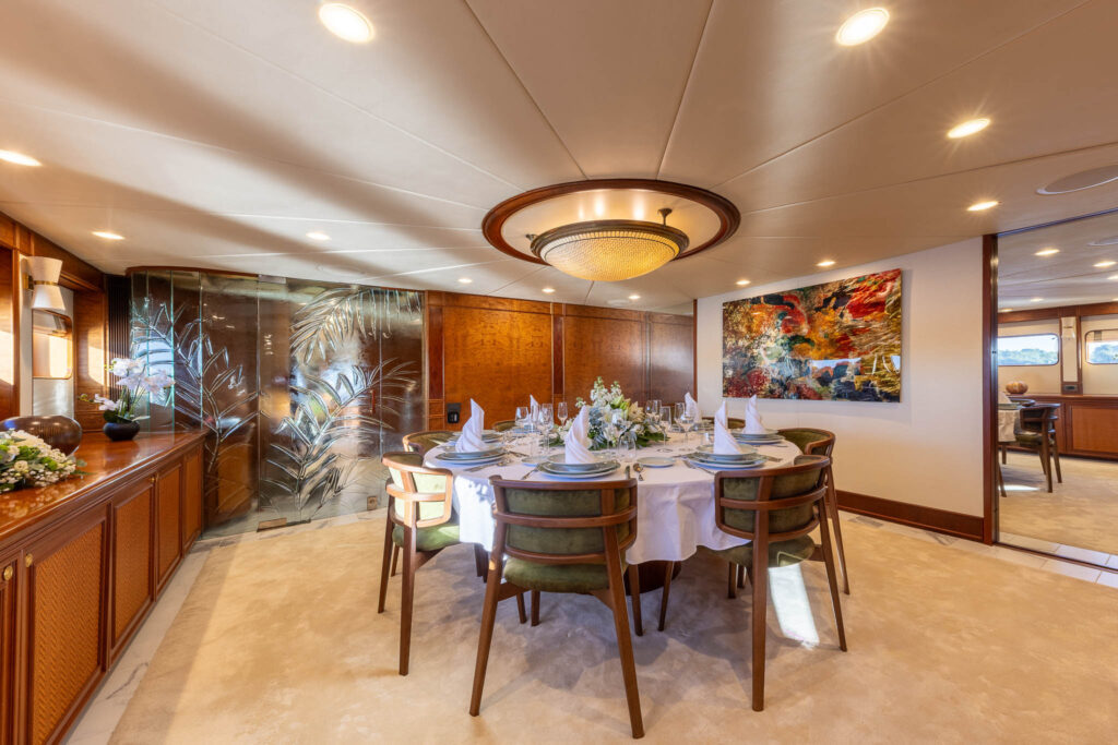 The dining area serves as an atmospheric tribute to the Amazon rainforest, while the five guest cabins — accommodating up to 10 guests — offer refined comfort through layered Safran fabrics, decorative weaves and warm, tactile textures. Each space has been carefully curated to feel both artistic and inviting, transforming the yacht into a floating private residence rather than a traditional charter vessel.